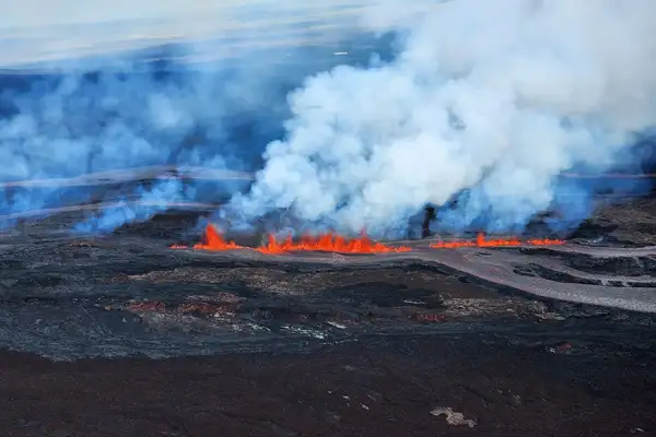 Tourists and residents evacuate as volcano erupts near Grindavik, Iceland.